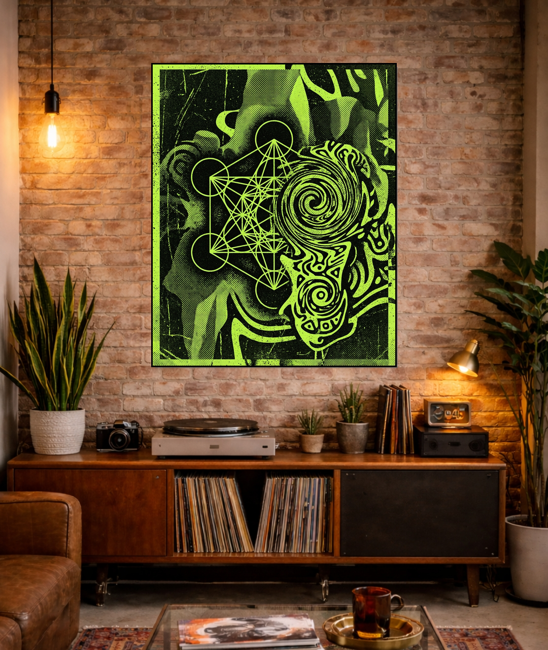 Dive into 'Cosmic Ritual,' a breathtaking art print that reinterprets Metatron's Cube through the vibrant lens of Psychedelic Flat Art. This piece is a captivating exploration of sacred geometry, presented with an unmistakable contemporary edge. Bold, clean lines and an electrifying palette converge to create a flat, graphic aesthetic that shimmers with an otherworldly energy. Each carefully rendered element contributes to a sense of profound depth without relying on traditional perspective, inviting viewers to contemplate ancient wisdom through a modern, hypnotic visual language. Perfect for the discerning collector seeking to infuse their space with a powerful, meditative presence and a splash of vibrant, spiritual abstraction.