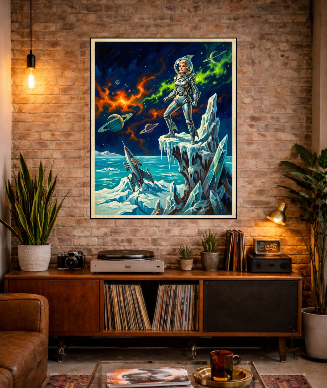 Dive into a vibrant tableau where audacious retro-futurism takes flight. This art print introduces a captivating Venusian princess, a quintessential heroine embodying the daring spirit of mid-century pulp fiction. With an expression of resolute determination, she commands her sleek, bubble-topped rocket ship, a true icon of golden age sci-fi design, ready to embark on interstellar adventures. The artwork masterfully channels the electrifying energy, bold lines, and richly saturated color palette synonymous with classic sci-fi magazine covers and B-movie posters. It’s a nostalgic journey back to an era of boundless optimism and fantastical exploration, where alien worlds and heroic women reigned supreme. Perfect for collectors who appreciate the audacious charm of vintage speculative fiction, this piece infuses any space with a thrilling sense of retro style and cosmic wonder. An essential addition for fans of iconic space opera and graphic art.