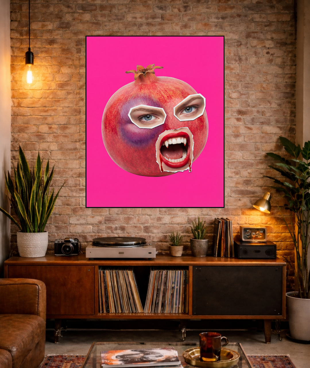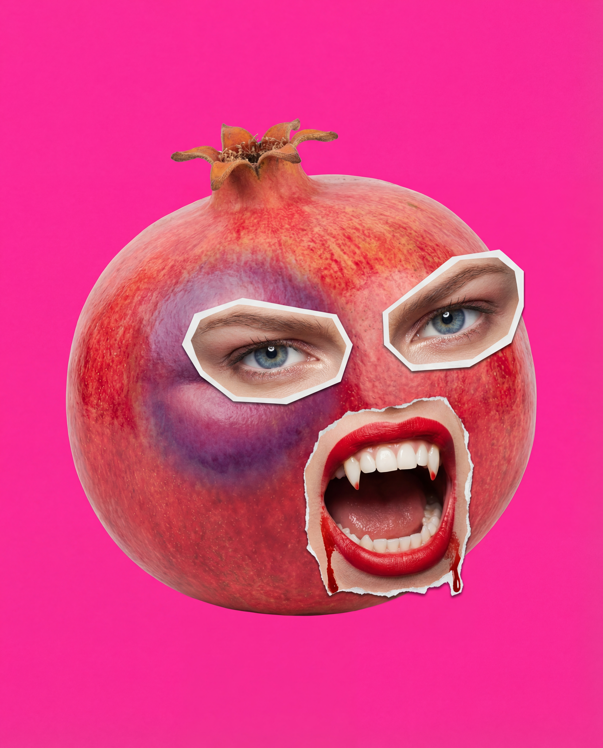 A grotesque pomegranate with feminine rage. Pop-surrealist collage art featuring woman's eyes and red lips on violated fruit. Dark humor meets high fashion.