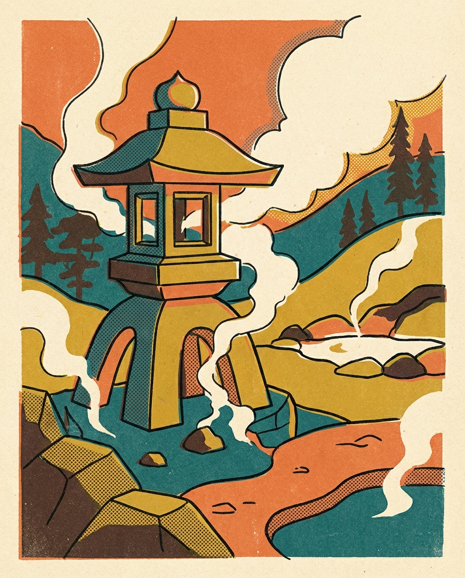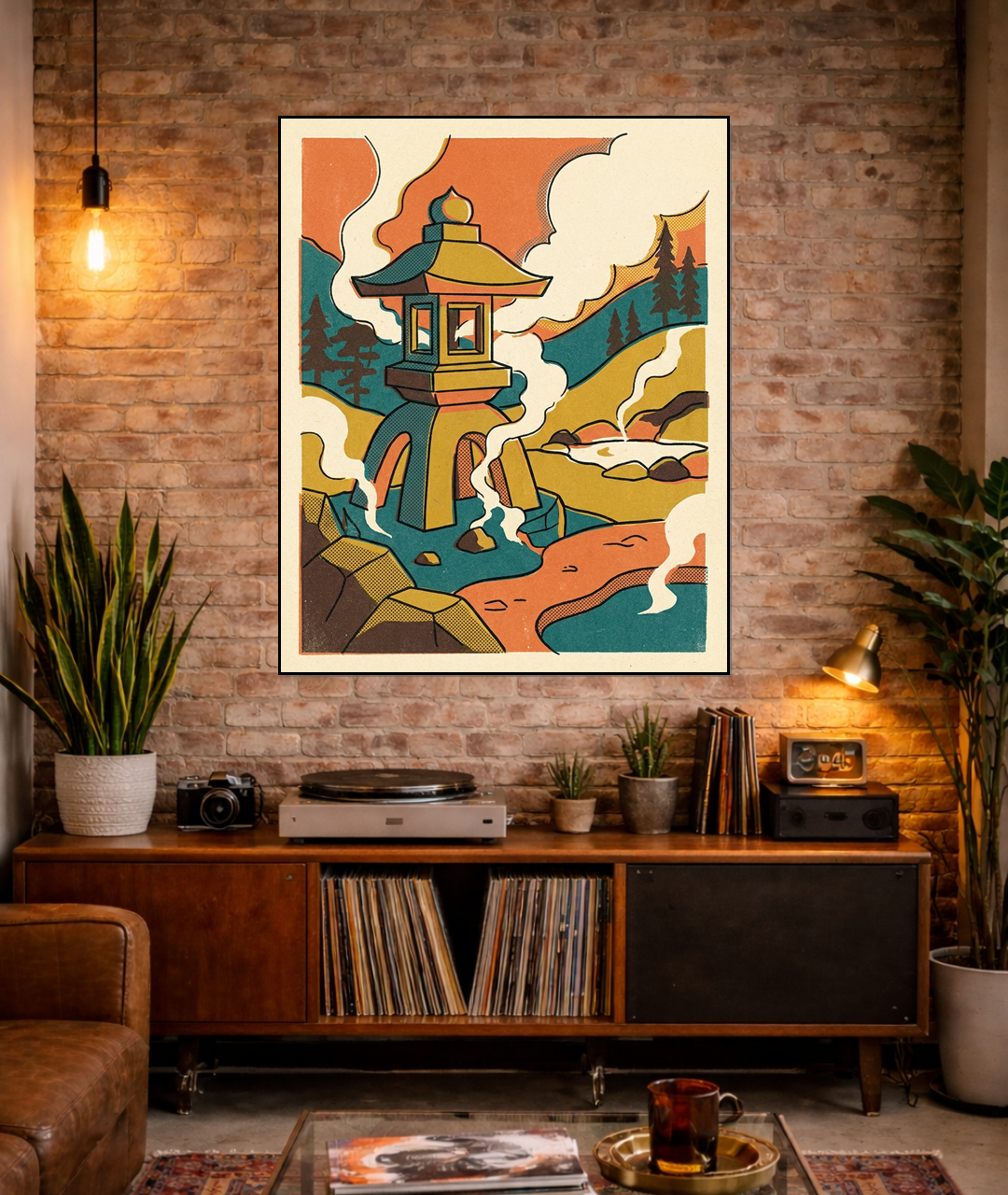 Step into a nostalgic vision of Japan with 'Garden Sentinel,' an art print that perfectly captures the charm of mid-century tourism posters. This piece features a venerable stone lantern, rendered with the bold lines and simplified forms characteristic of the Japanese Retro Tourism aesthetic. Vibrant, warm hues evoke the glow of a serene garden at dusk, while subtle textures hint at the lantern's ancient granite. It’s a stylish homage to classic travel art, blending traditional Japanese iconography with a distinctly vintage appeal. Ideal for collectors seeking artworks that tell a story of cultural heritage and design innovation, this print brings the tranquil spirit of Japan's timeless landscapes into any modern space, offering a peaceful focal point and a touch of retro elegance.