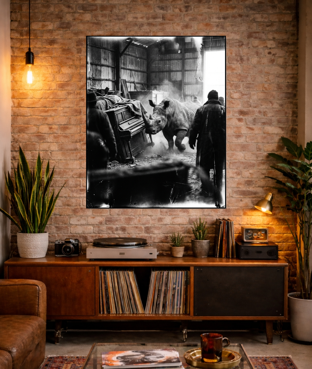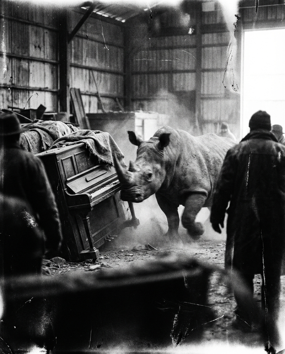 Experience the electrifying tension of 'Ivory Charge,' a masterfully crafted Film Noir photograph that orchestrates an impossible collision of raw power and sophisticated artistry. This dramatic print features a formidable rhino in mid-charge, its imposing form silhouetted against the unexpected elegance of a grand piano. Rendered in a stunning high-contrast monochromatic palette, the image utilizes classic chiaroscuro lighting, casting deep, dramatic shadows that sculpt the rhino's textured hide and the piano's reflective surfaces. Every detail evokes a palpable sense of mystery and a timeless, gritty beauty, hallmarks of the Film Noir aesthetic. A truly unique and compelling statement piece, this artwork is perfect for collectors who appreciate avant-garde compositions and the profound narrative possibilities of black and white photography, transforming any space into a gallery of sophisticated intrigue.