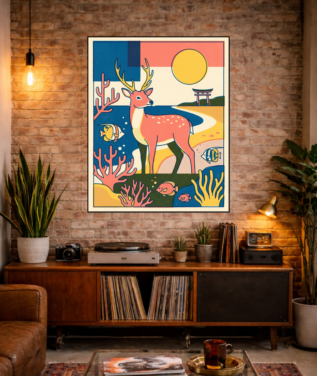 Journey back to the golden age of travel with this captivating art print, embodying the charming Japanese Retro Tourism aesthetic. 'Nara Spirit' beautifully renders an iconic Japanese deer, its serene presence framed by the vibrant, graphic lines reminiscent of classic Showa-era travel posters. Bathed in a palette of warm, inviting hues, the artwork captures a nostalgic elegance, blending traditional Japanese motifs with a mid-century modern sensibility. The bold, clean forms and stylized natural elements evoke a sense of wanderlust and timeless beauty, making it a perfect addition for collectors seeking pieces that fuse historical charm with artistic sophistication. Let this print transport you to a bygone era of Japanese allure and graceful wilderness.