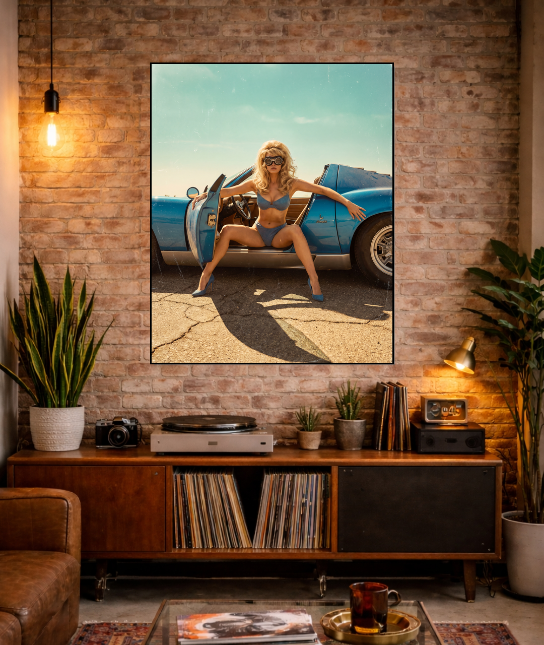 A stunning blonde in vintage goggles poses in a blue Lamborghini. Blue bikini and blue high heels match the car perfectly. Warm vintage film grain and glamorous retro style.