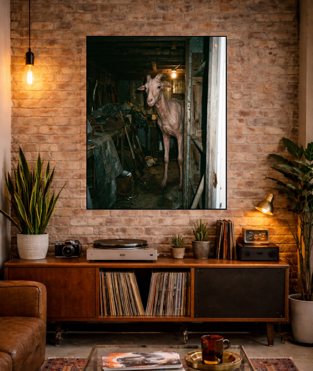 Immerse yourself in the chilling depths of 'Shorn Terror,' a photorealistic horror masterpiece that blurs the line between nightmare and reality. This striking art print captures a goat-like creature with unnervingly shaved horns, rendered with exquisite detail that brings every sinew and shadow to life. The artist's meticulous hand creates a hyper-realistic portrayal, inviting viewers to confront a primal fear within a familiar form. Ideal for collectors drawn to the dark aesthetic, this piece evokes a visceral response, challenging perceptions with its unsettling gaze and impeccable execution. It's a testament to the power of art to disturb, provoke, and command attention in any curated space, offering a truly unique and spine-tingling addition to a discerning collection.
