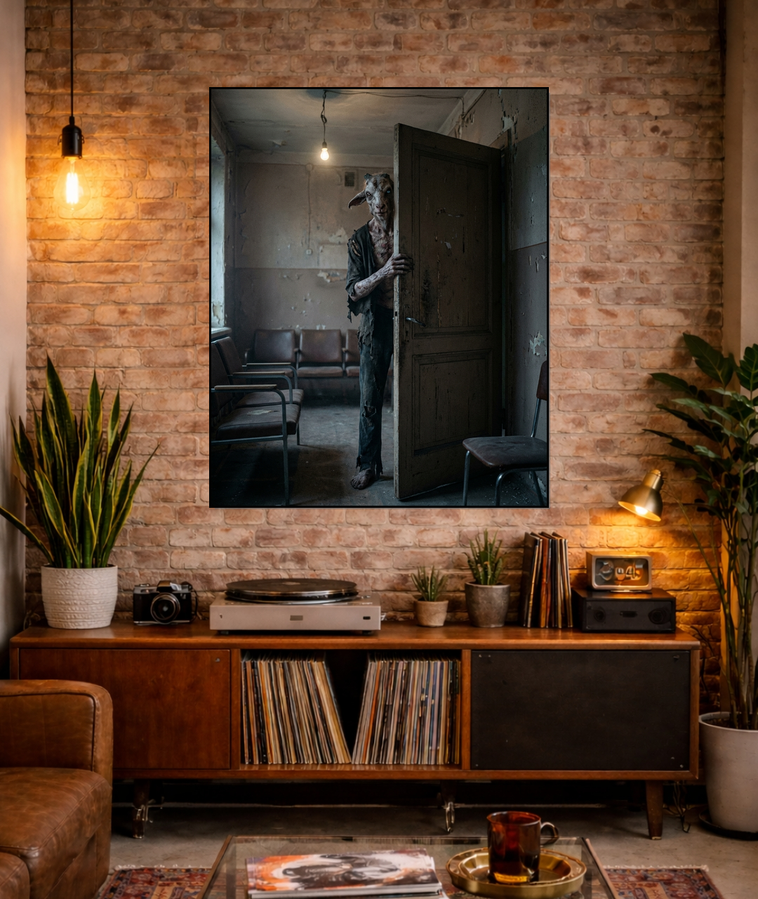Dive into the unsettling depths of 'Wretched Visage,' a masterful art print that exemplifies the photorealistic horror genre. This piece meticulously renders a goat humanoid, its features disturbingly lifelike, adorned with an intricate tapestry of skin diseases. Every blemish, every raw patch, every pustule is depicted with unflinching hyperrealism, creating a visceral and deeply unsettling experience for the viewer. The meticulous detail transforms the grotesque into a subject of morbid fascination, inviting collectors to confront the uncomfortable beauty of decay and mutation. This print is a powerful statement, challenging perceptions and offering a profound, albeit disturbing, exploration of the human — or rather, inhuman — condition. An essential acquisition for collectors seeking art that pushes boundaries and masterfully fuses the real with the repellent.