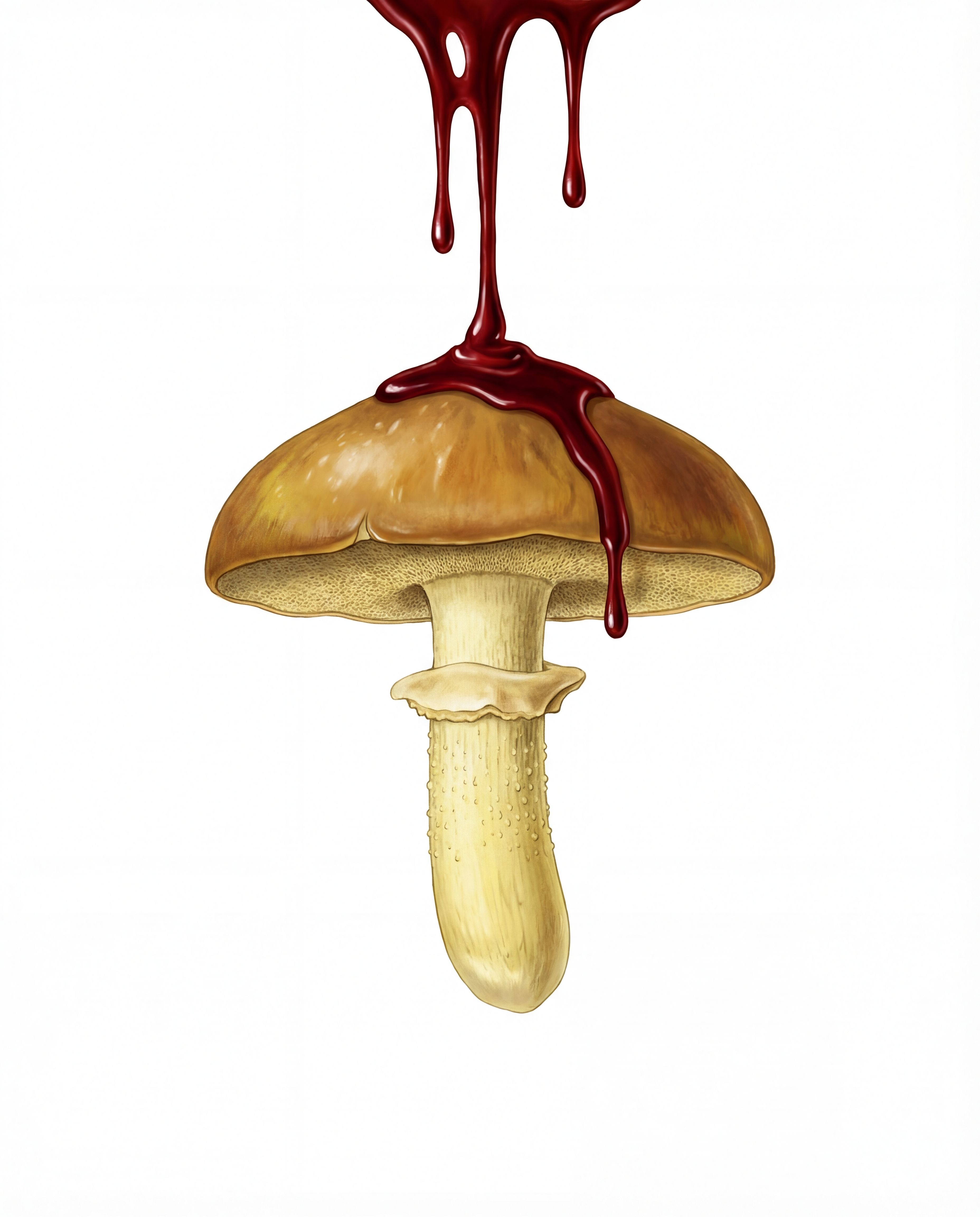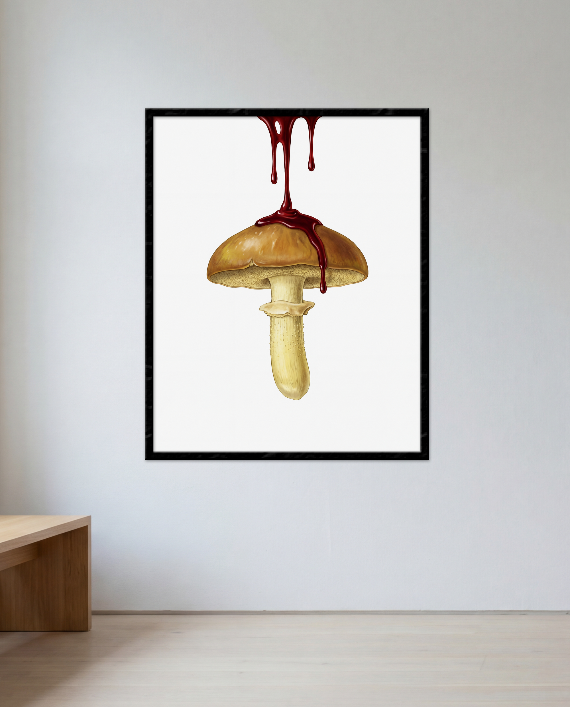 Immerse yourself in the visceral beauty of 'Crimson Spore,' a captivating art print that reinterprets the common Suillus luteus with a darkly enchanting twist. This piece embodies the distinctive 'Bloody Mushroom' aesthetic, transforming the humble slippery jack into an object of macabre fascination. Deep sanguine hues saturate its form, suggesting a life force both grotesque and alluring. Every detail, from the glistening cap to the robust stem, is rendered with an intense, almost fleshy texture, inviting viewers to ponder the delicate line between decay and vibrant existence. Perfect for collectors drawn to pieces that challenge perceptions and celebrate the darker, more organic side of nature's artistry, 'Crimson Spore' offers a unique blend of botanical study and gothic fantasy.